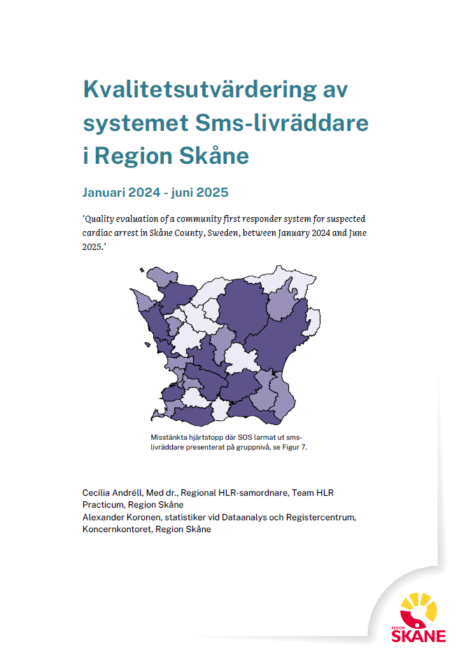 Uppföljningen omfattar utlarmningar vid misstänkta hjärtstopp och belyser bland annat täthet av livräddare, avstånd till den drabbade och tid till livräddande insatser. Rapporten beskriver Sms-livräddares funktion som ett komplement till den prehospitala vården i Skåne.