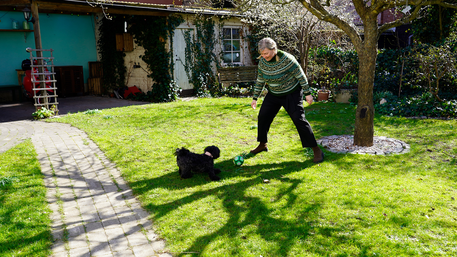 Lena Frisk och hunden Doris leker ofta och gärna i trädgården tillsammans. Foto: Region Skåne